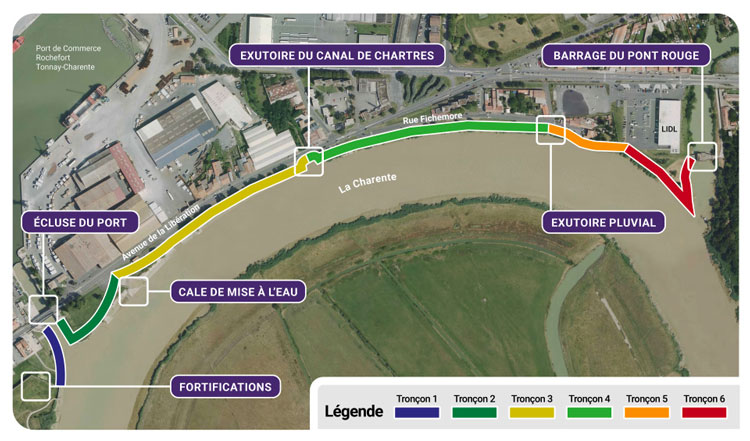 Réalisation d’un ouvrage de protection sur les berges de la Charente au niveau du quai Libération à Rochefort (de l’avenue de la Libération à la rue Fichemore). Cette digue permet de sécuriser le port de commerce, la zone industrialo-portuaire et le quartier Libération contre le phénomène de submersion.