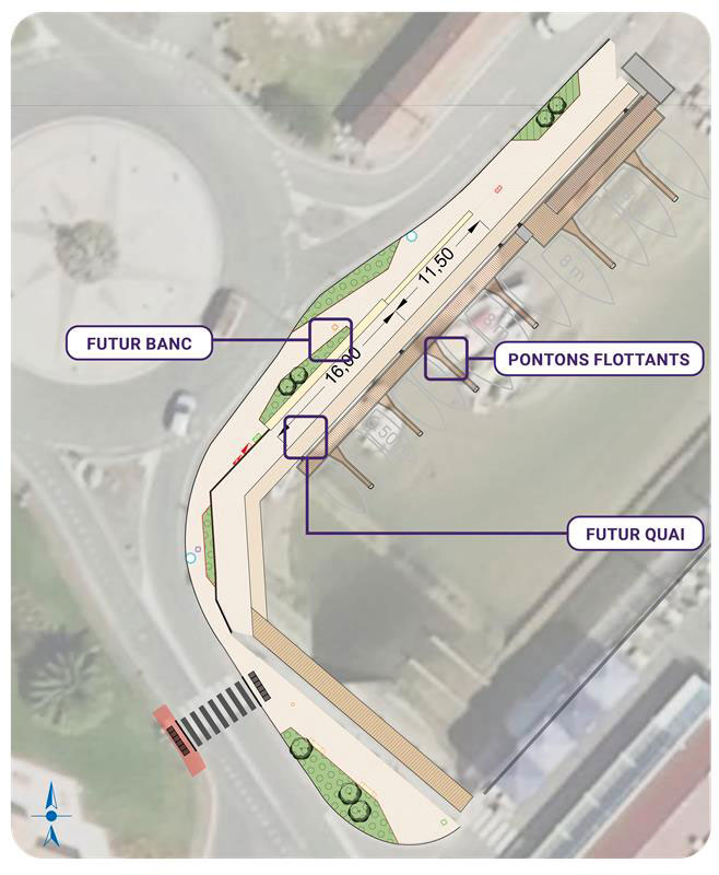 - la pose de pontons flottants de 45 m au total avec une passerelle d’accès pour le stationnement de 12 navires de plaisance et le mise en place d'une borne de distribution de fluides.