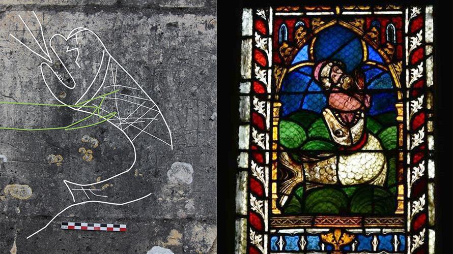 Dans ce cas, est-ce que le visage est celui de Jonas dépassant du monstre marin ? Ou est-ce que seule est présente la baleine attaquant le bateau ? Jonas avalé par la baleine (passant trois jours et trois nuits dans le ventre de l'animal avant d'être recraché), est un thème biblique symbolisant la résurrection. Il se retrouve par exemple dans les chapiteaux sculptés et imagés de l’abbaye de Mozac (Puy-de-Dôme), dans l’ancien palais de Justice de Saint-Maximin (Var) ou sur les vitraux du temple Saint-Etienne de Mulhouse (Haut-Rhin).