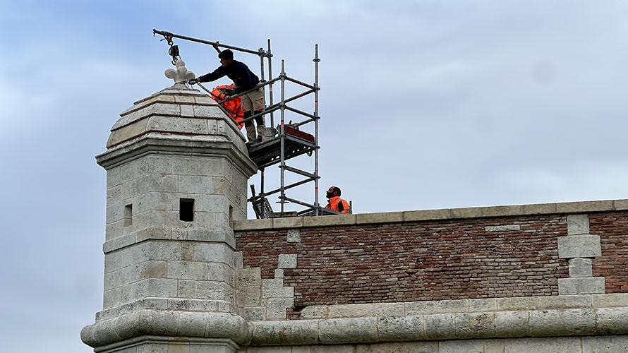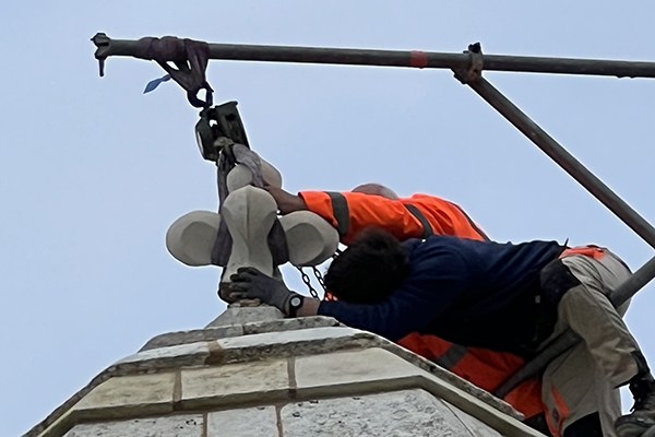 Pose d'une nouvelle fleur de lys sur l’échauguette du bastion d’Hiers à Brouage. Un geste symbolique qui marque une étape importante dans la restauration des remparts de la citadelle.