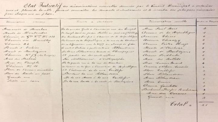 Avec l'exemple de Jonzac, découvrez un tableau indiquant le changement de dénominations d’un certain nombre de rues, avenues et places de cette commune à la fin du XIXe siècle.